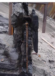 In de 'Woerden 7' zijn verschillen soorten gesmede spijkers gebruikt. Om het vulstuk tussen de overgang van de boord naar de heve vast te zetten is gebruik gemaakt van een spijker met een lengte van 60 cm! De leggers en de vlakgangen werden verbonden met spijkers van ongeveer 10 cm. Deze waren minder hard waardoor ze omkrulden voordat ze de vlakplank doorboorden. Ten behoeve van het vastzetten van het breeuwsel werden van onderaf om de 5 cm kleine kopspijkertjes in de naden tussen de vlakgangen geslagen. |