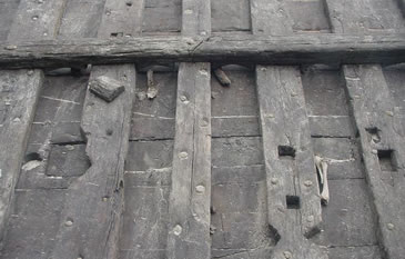 Een enorme spijker bevestigt de vulstukken in het kimhout op de overgang van het ruim naar de heve.