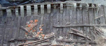 Overzicht van het spoel- en drijfhout in het ruim van de 'Woerden 7'. [foto Hazenberg Archeologie Leiden] |