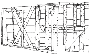 Getekend bovenaanzicht van de kruislings geplaatste leggers in het voorschip van de Zwammerdam 6.
