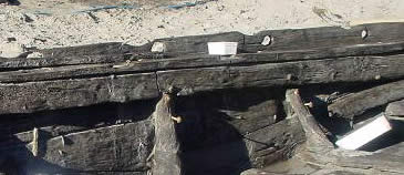 | De dolboordgaten dienden om de lussen van de roeiriemen te bevestigen aan het schip. [foto: Hazenberg Archeologie Leiden] |