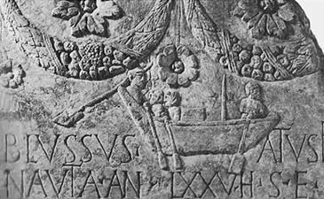 Op de grafsteen van schipper Blussus staat een schip met zowel voor als achter roeispanen, en verder een roerinrichting, een mast en lading aan boord in het midden van het schip.