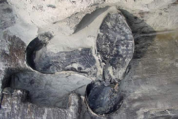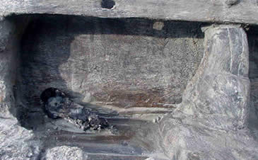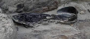 Deze restanten van een leren schoen met bespijkerde zool zijn gevonden op de bodem van het schip, aan stuurboordzijde ter hoogte van de roeiinrichting.