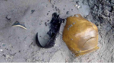 Ook naast het schip werd vondstmateriaal geborgen, waaronder deze schoenresten en fragmenten van en een compleet potje van geverfd aardewerk. [foto: Hazenberg Archeologie Leiden]