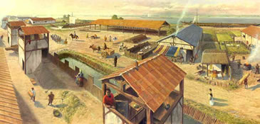 | Zicht op de linkerpoort van het castellum Laurium en de daarbuiten gelegen vicus en Rijn.