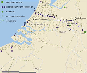 15 Woerden (Laurium), 16 Bodegraven, 17 Zwammerdam (Nigrum Pullum), 18 Alphen aan den Rijn (Albaniana), 19 Leiden-Roomburg (Matilo), 20 Valkenburg (Praetorium Agrippinae), 21 Katwijk-Brittenburg (Lugdunum), 22 Oostvoorne (Helinio?), 23 Goedereede-Oude Wereld, 24 Walcheren-De Roompot, 25 Aardenburg, 26 Velsen (Flevum), 27 Ermelo. Tekening Rob Mols/Bureau Archeologie Gemeente Nijmegen.